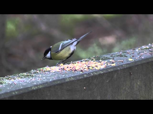 Une mangeoire sur un ponton en forêt.